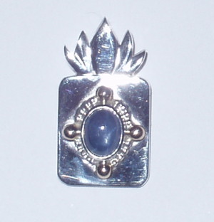 トップは蓮の花をイメージしました。 清らかな心を持つクライエントさんのイメージそのものなのです。 まわりに惑わされる事なく、ポッカリと美しい花を咲かせる蓮と サファイアの周りにはアメリカ先住民では4方向を意味し 転生輪廻の意味も持つ4個の18金を配しました。 |